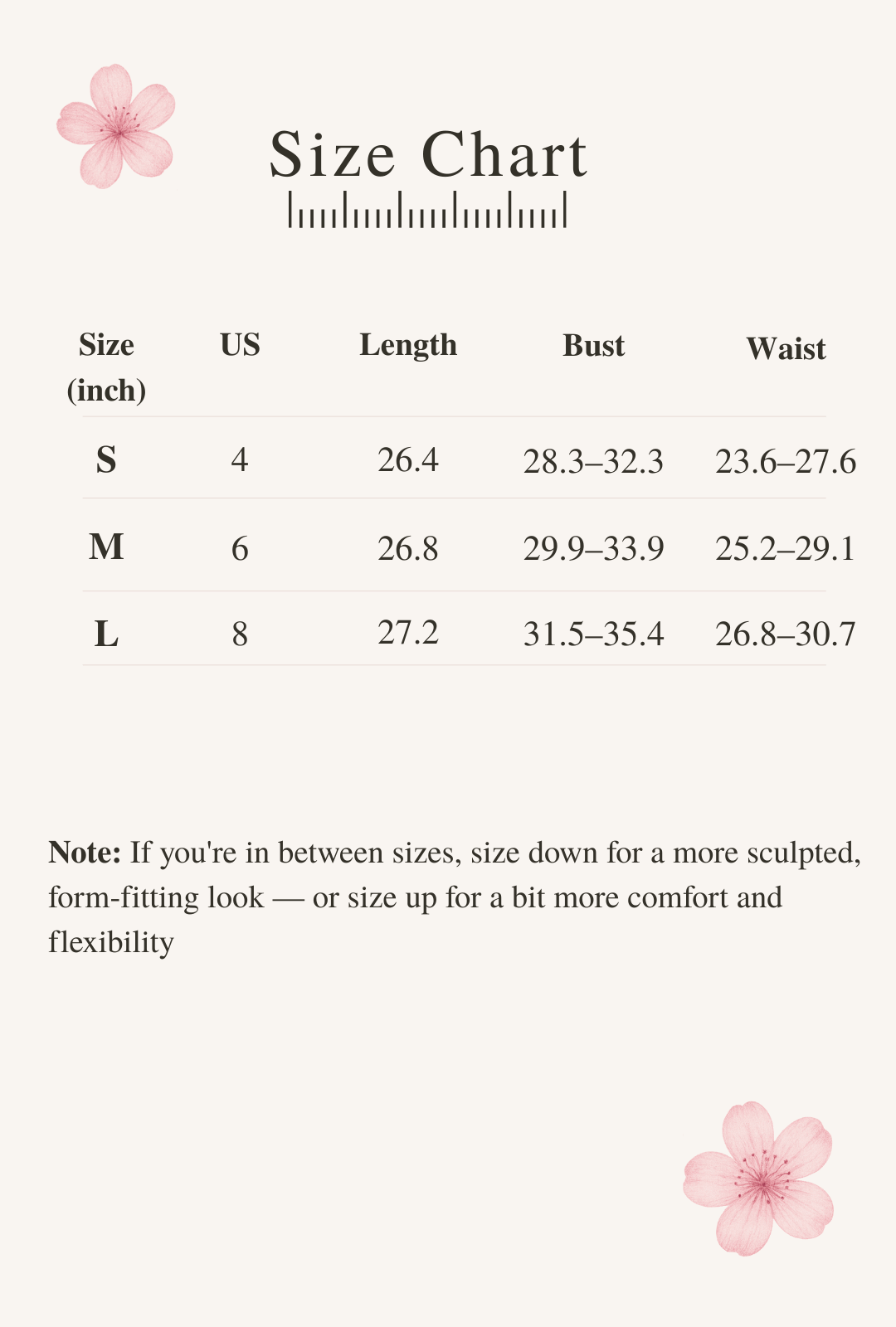 If you're in between sizes, size down for a more sculpted, form-fitting look — or size up for a bit more comfort and flexibility.